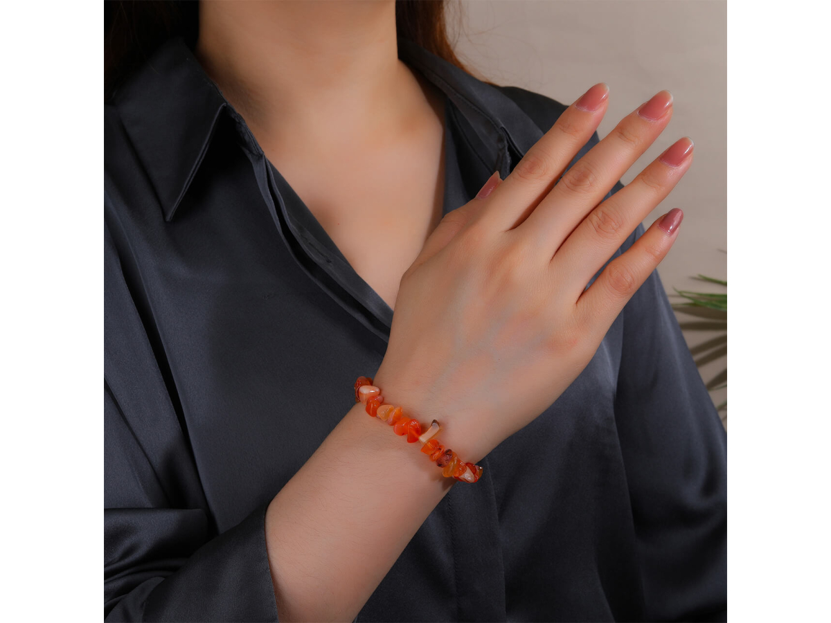 Kameny jsou navlečeny na pružné gumičce, která mu umožňuje přizpůsobit se velikosti zápěstí v rozmezí 17 až 21 cm. Díky pružnému materiálu se snadno přizpůsobí tvaru zápěstí, což zaručuje pohodlné nošení a univerzální velikost pro různé uživatele. Elegantní a praktický, tento náramek je ideální volbou pro každodenní nošení i speciální příležitosti.