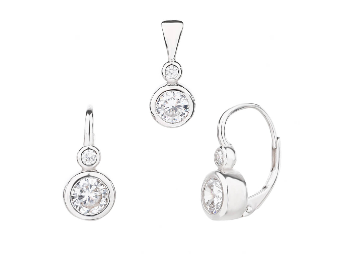 Stříbrná souprava s krásnými čirými zirkony. Ideálně slazené šperky náušnice s přívěskem. Zajistí vám neustálou ladnost a eleganci v každé situaci.