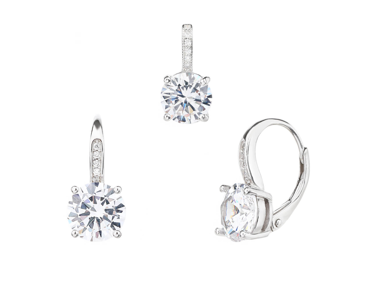 Stříbrná souprava s krásnými čirými zirkony. Ideálně slazené šperky náušnice s přívěskem. Zajistí vám neustálou ladnost a eleganci v každé situaci.