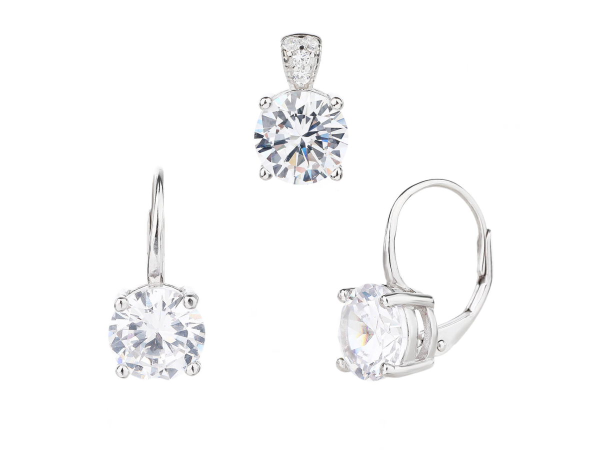 Stříbrná souprava s krásnými čirými zirkony. Ideálně slazené šperky náušnice s přívěskem. Zajistí vám neustálou ladnost a eleganci v každé situaci.