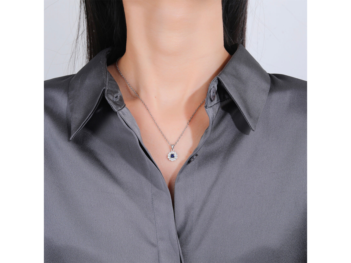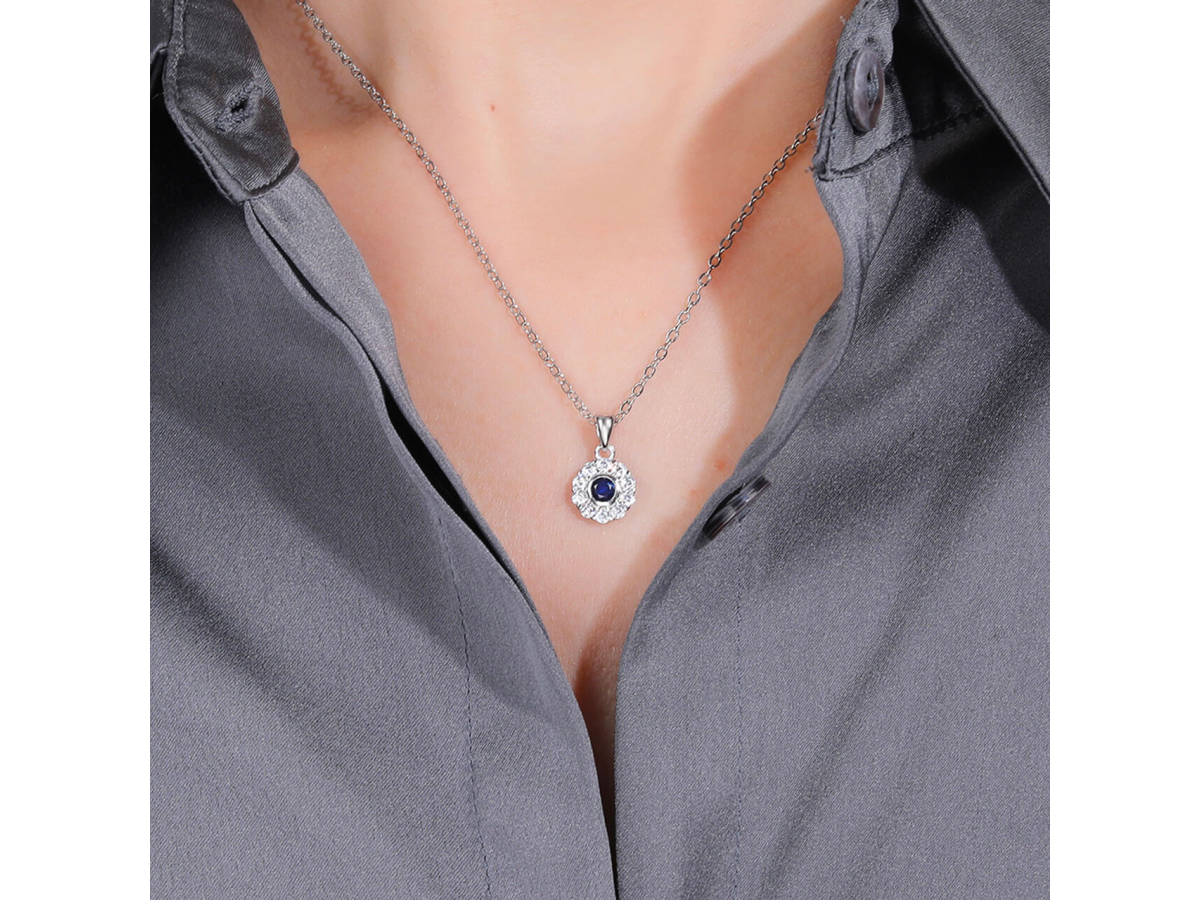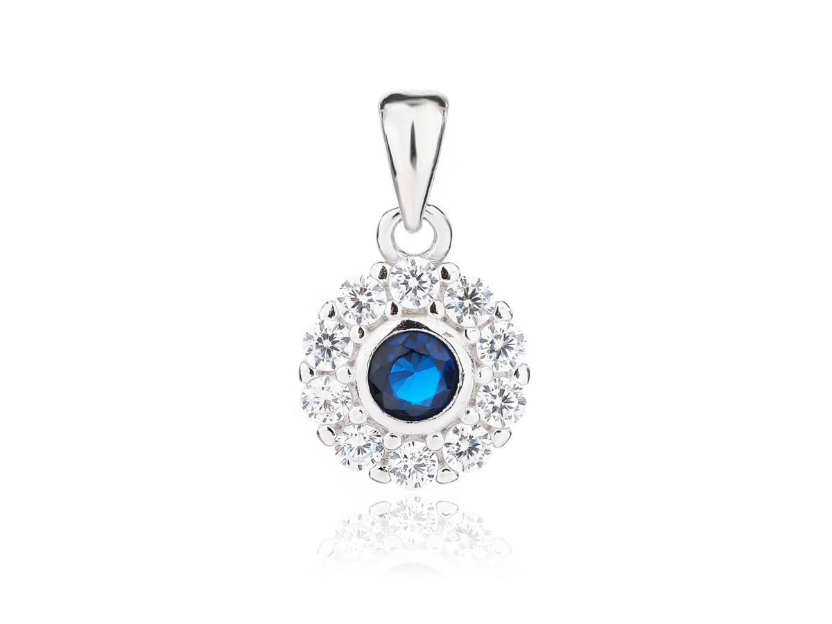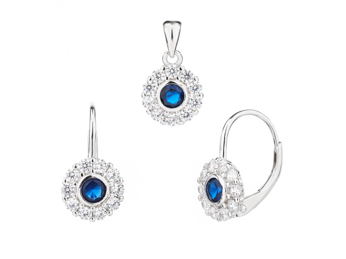 - Stříbrná souprava s centrálním kulatým kamenem je zvýrazněna jemným osazením menšími zirkony, které vytvářejí efekt zářící květiny a dodávají luxusní vzhled.