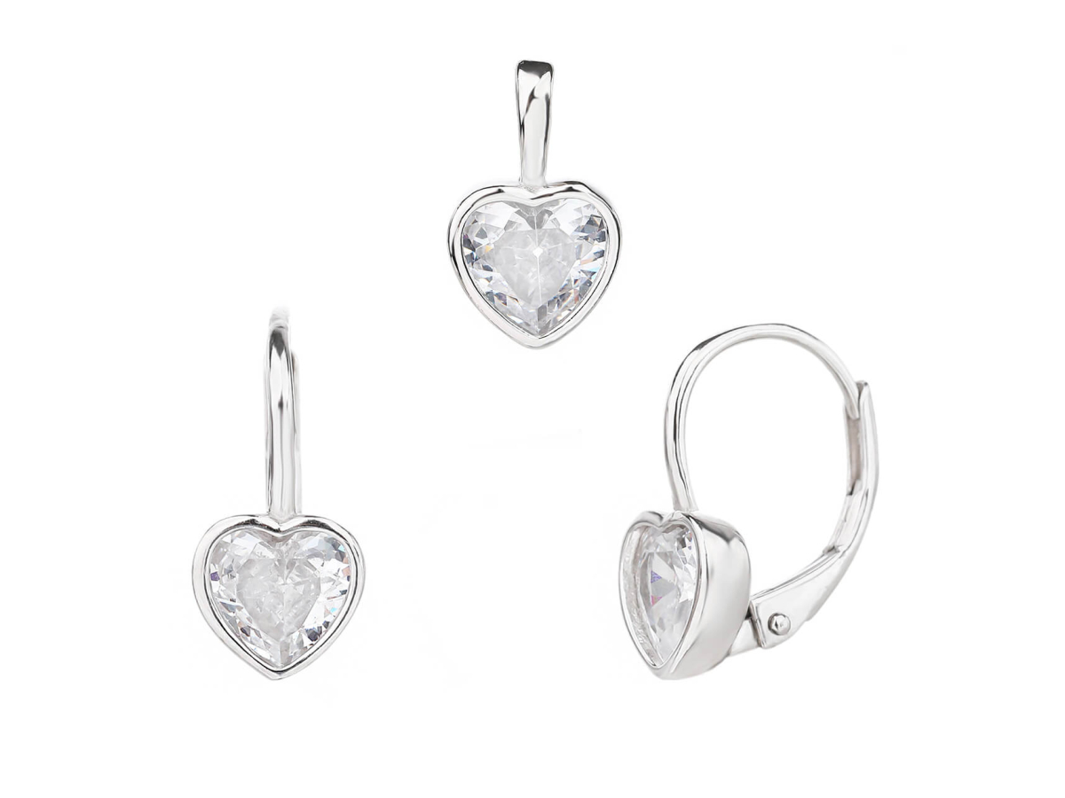 - Stříbrná souprava s motivem srdce doplněna o zářivé zirkony