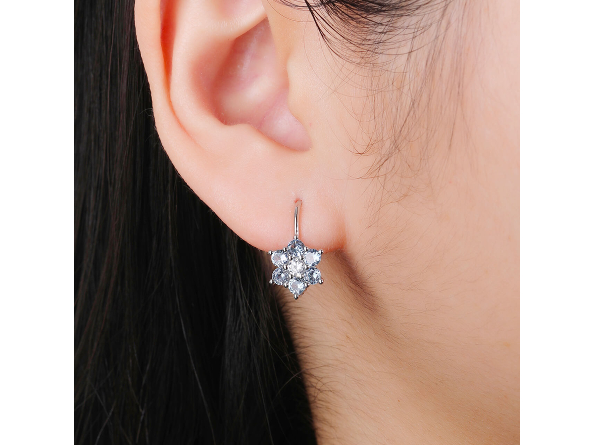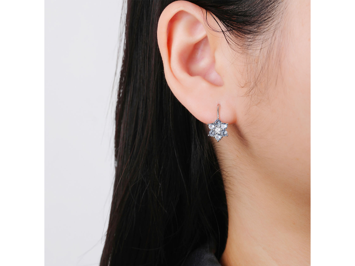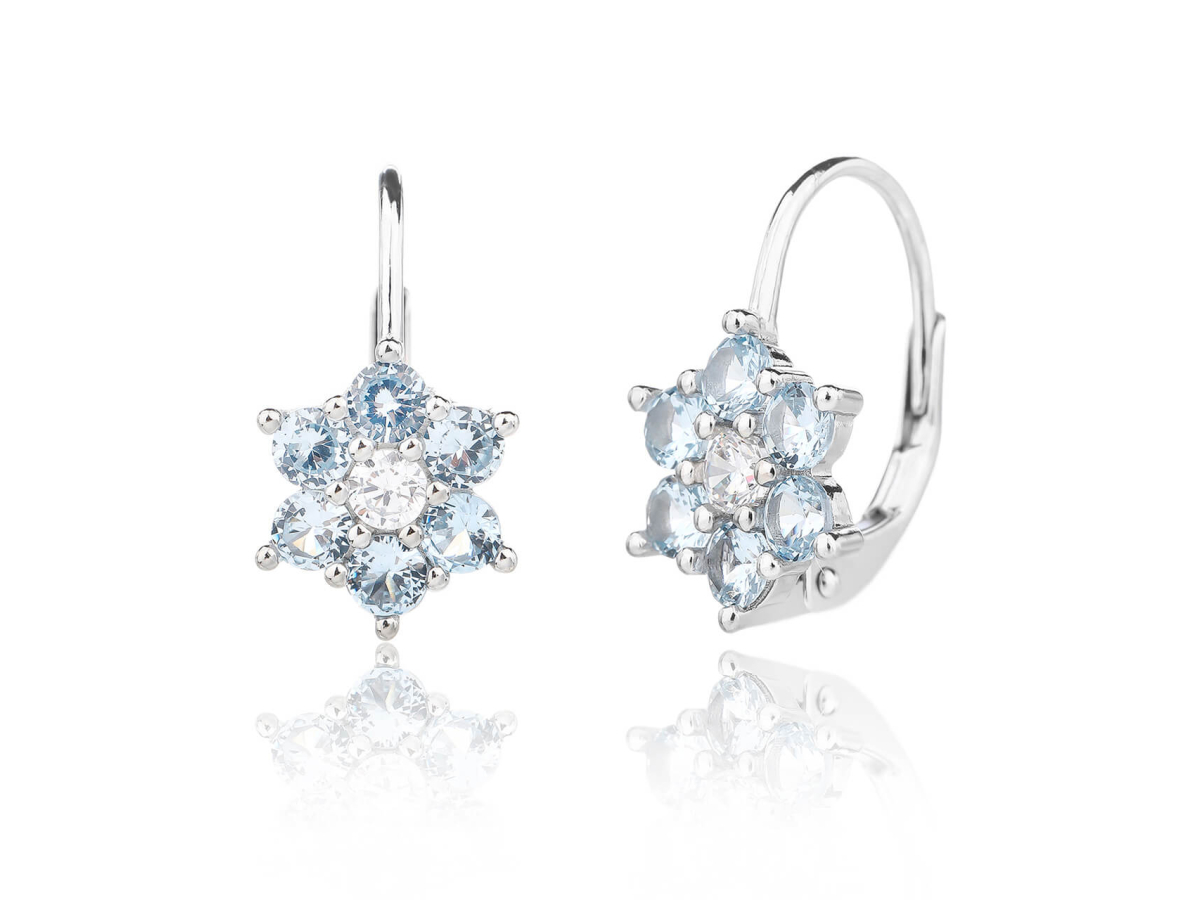 - Stříbrné náušnice ve tvaru květiny zdobené světle modrými zirkony