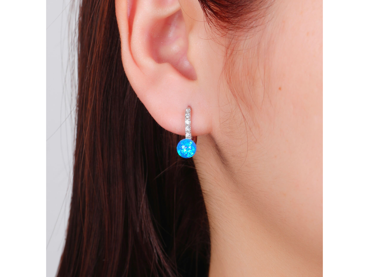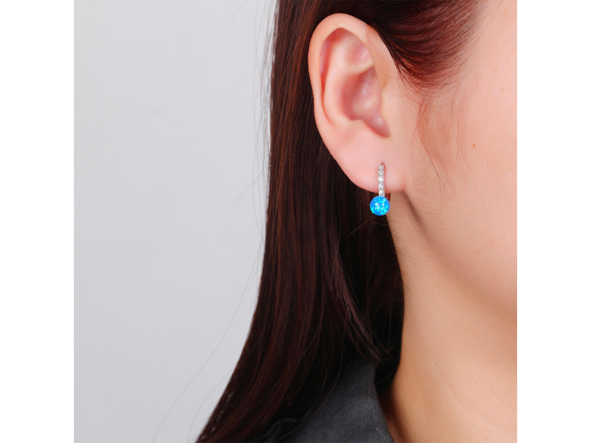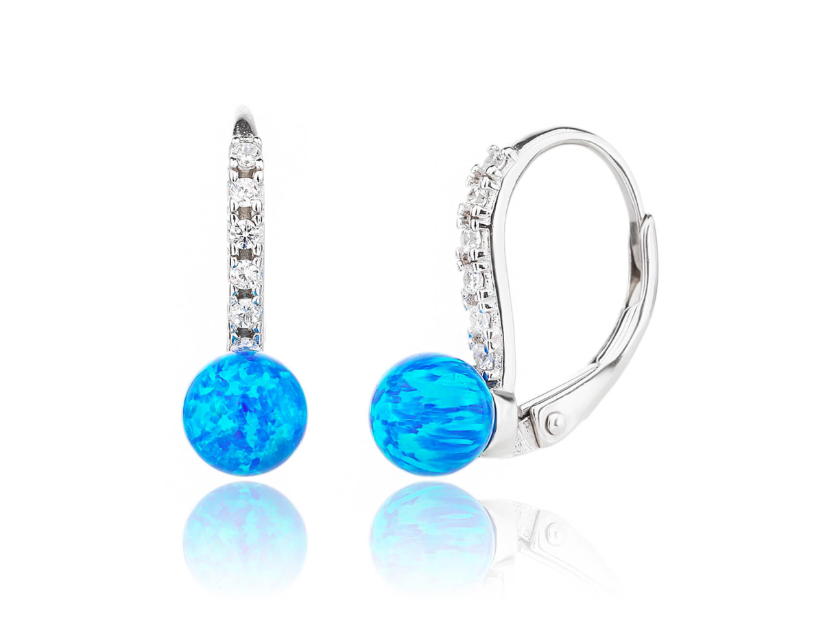 - Tyto stříbrné náušnice zdobí kulatý modrý opál, jehož magická hra barev připomíná hloubku oceánu.