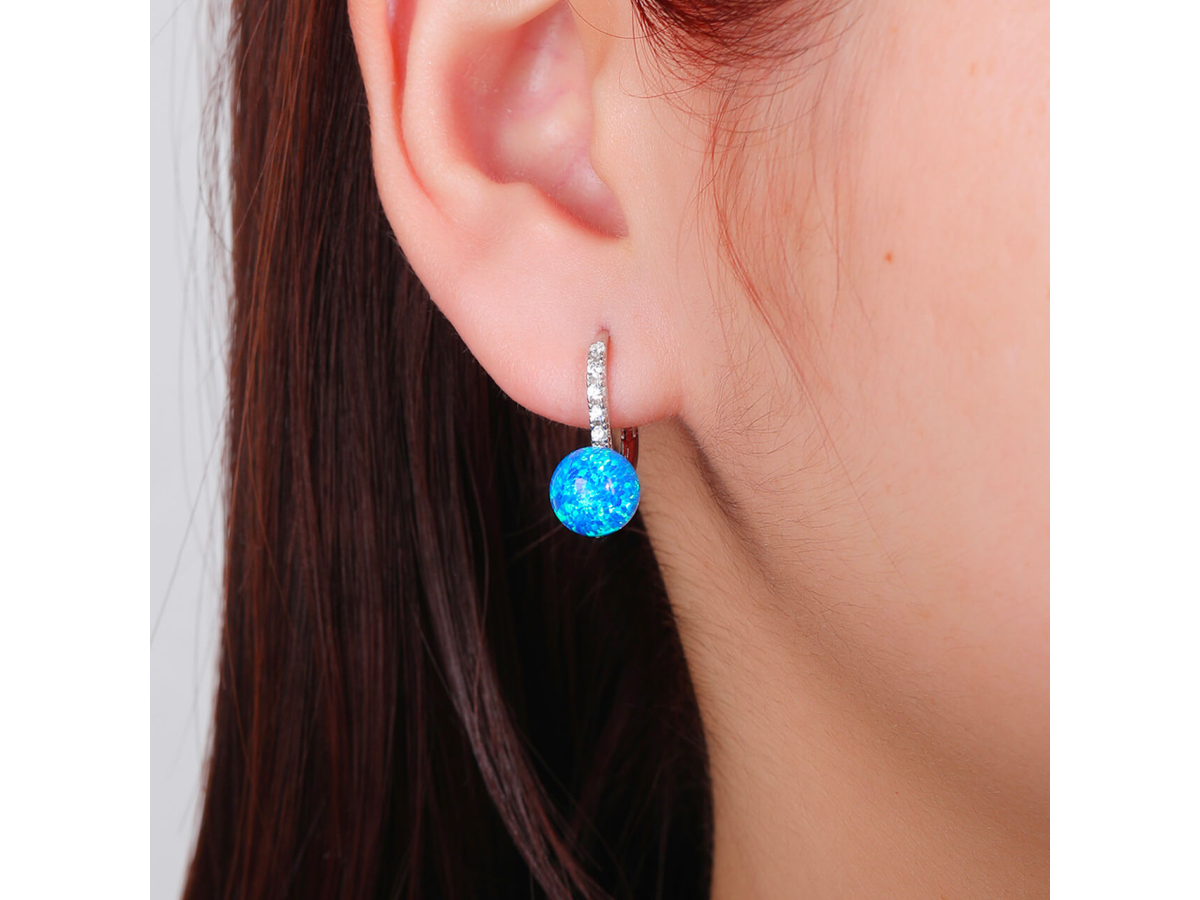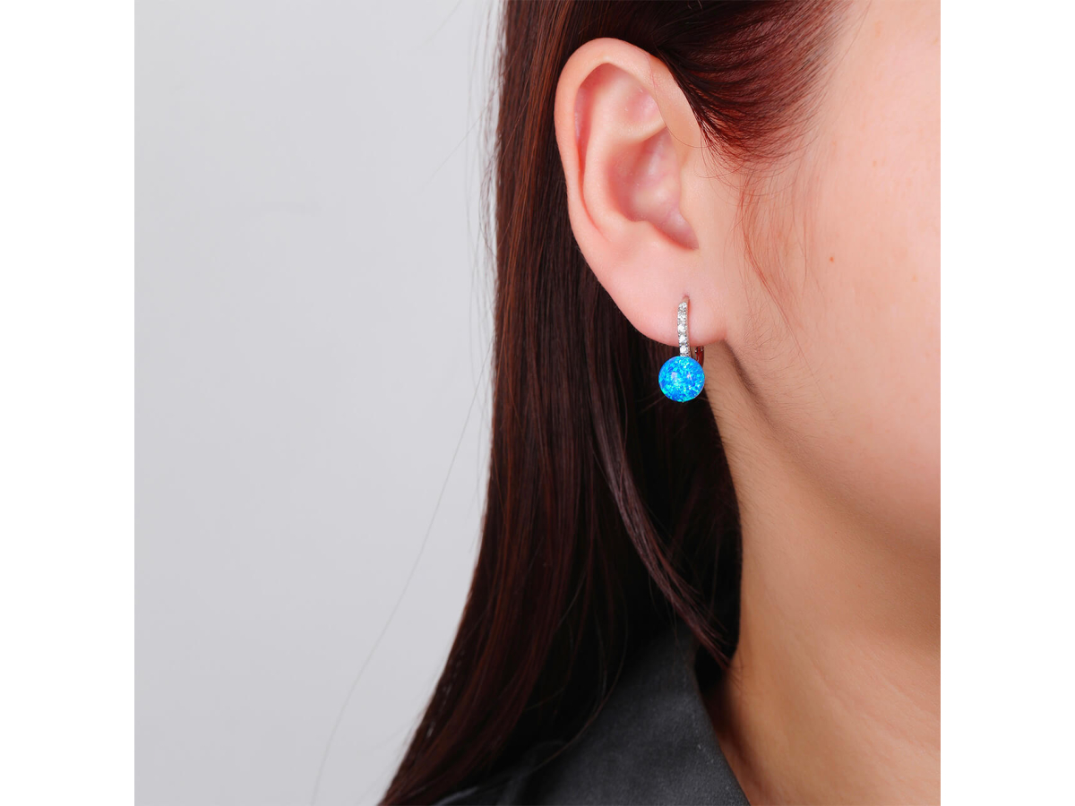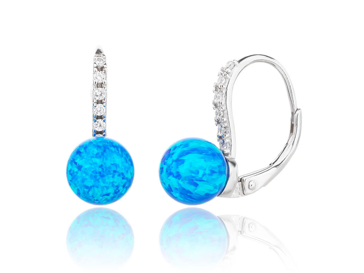 - Tyto stříbrné náušnice zdobí kulatý modrý opál, jehož magická hra barev připomíná hloubku oceánu.