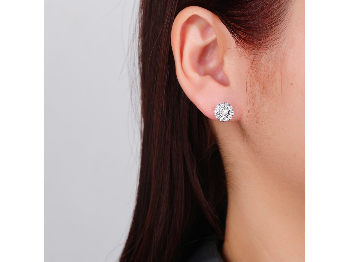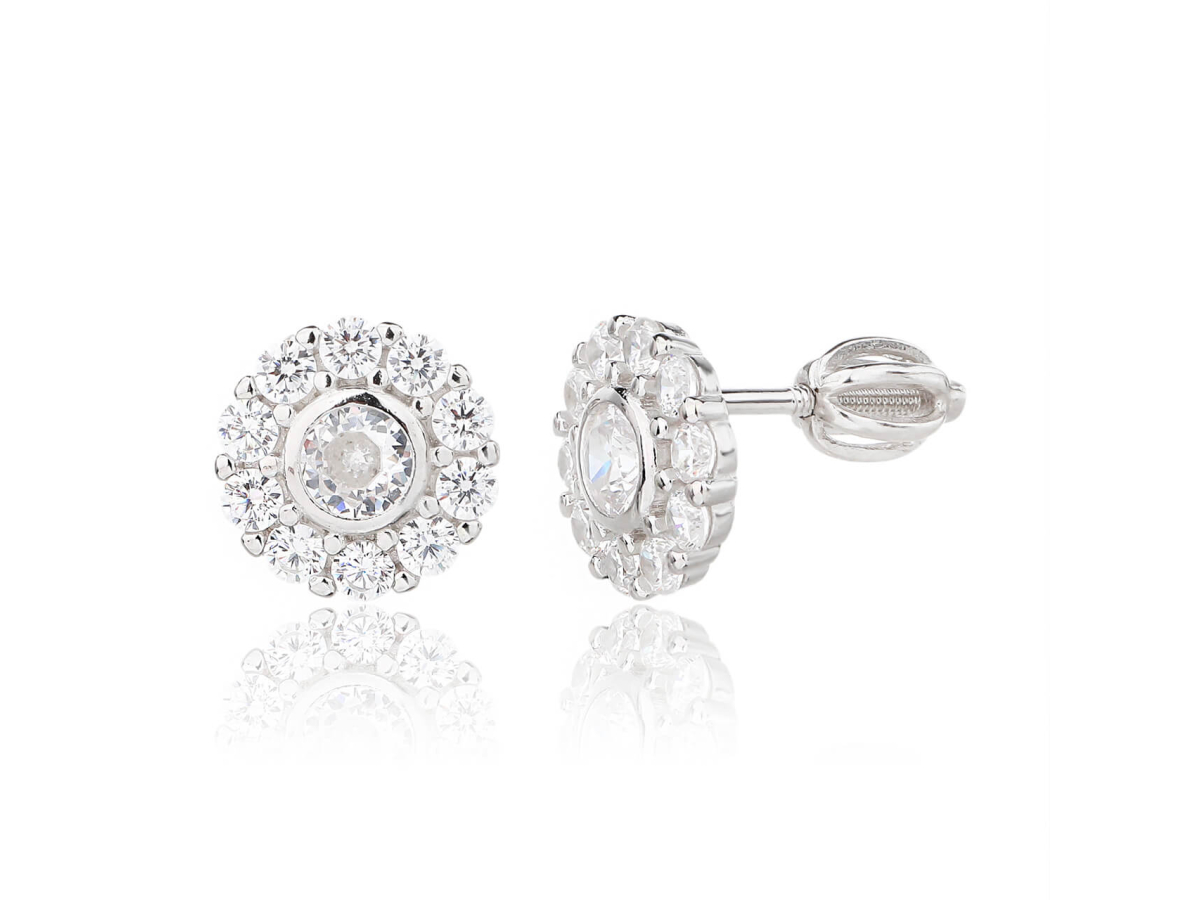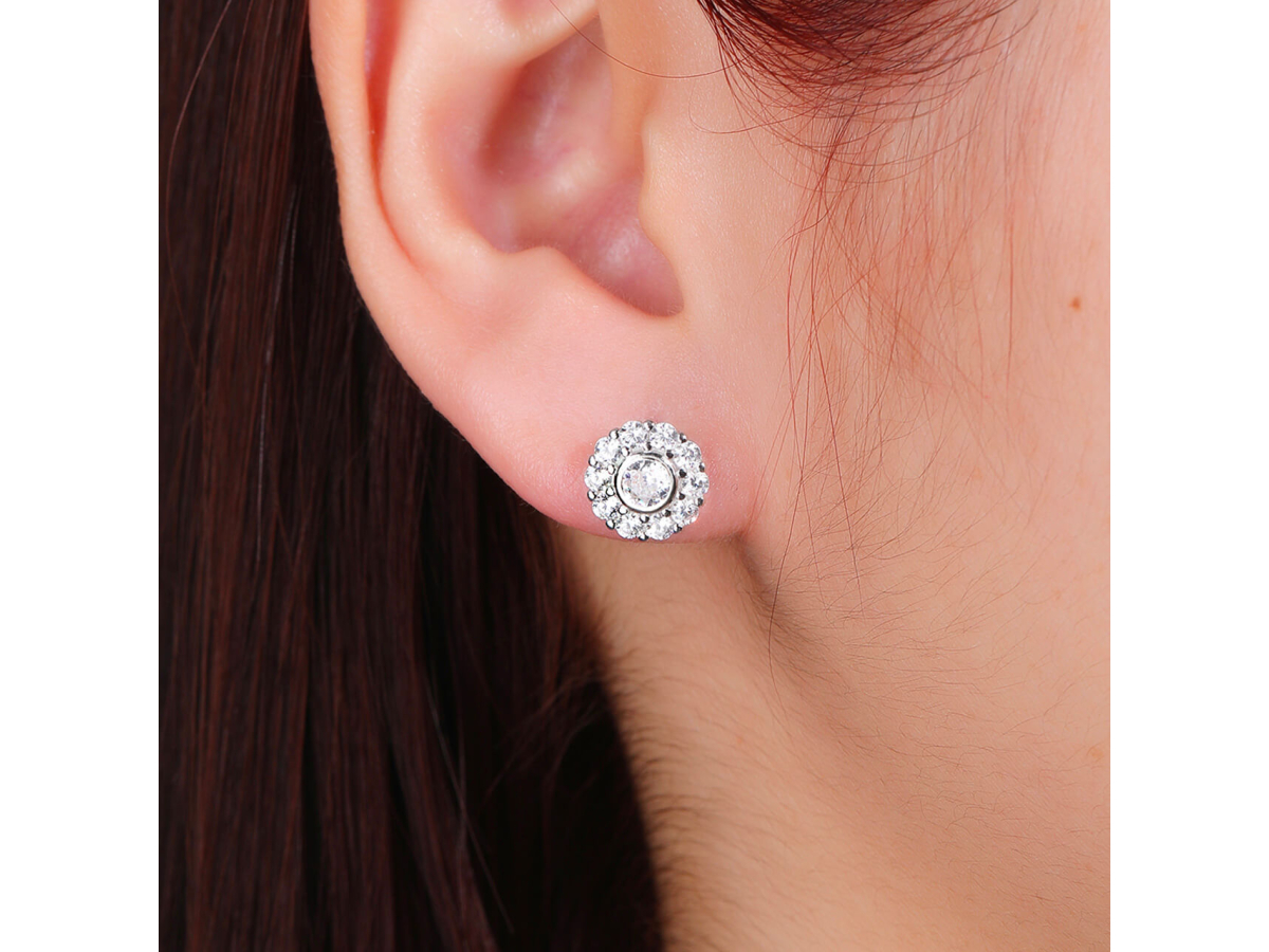 - Centrální kámen je zvýrazněn drobnými zirkony okolo, které násobí jeho třpyt a dodávají náušnicím luxusní vzhled.
