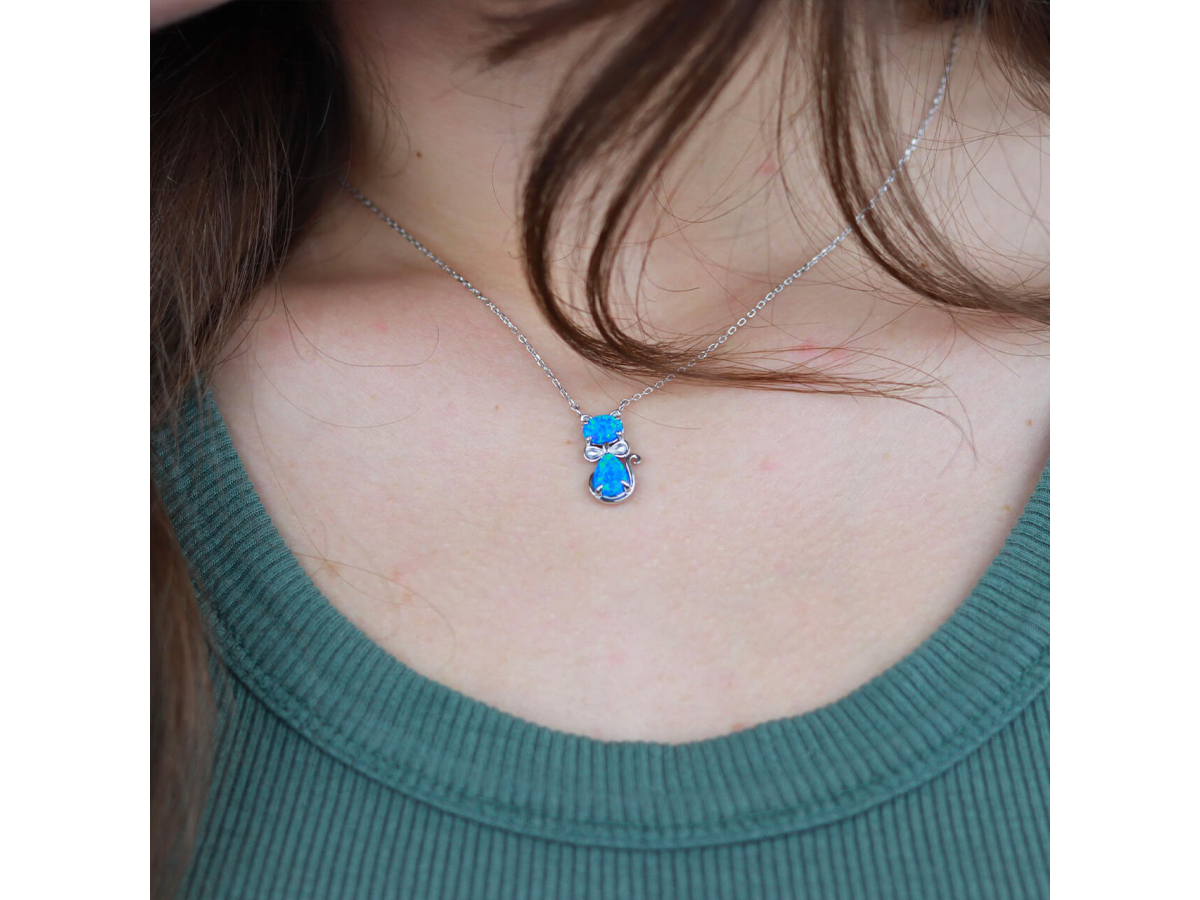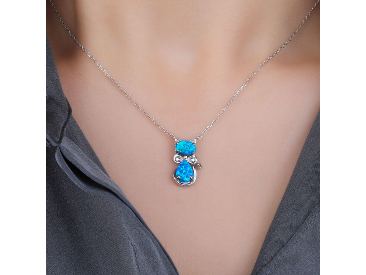 Stříbrný náhrdelník KOČKA modrý OPÁL Ag 925/1000