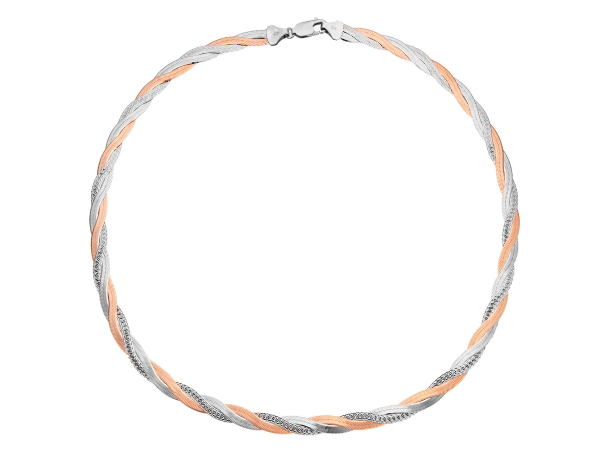 Krásný stříbrný náhrdelník s nádherně propletenými a diamanty broušenými řetízky. Nádherná varianta TRICOLOR - rhodiovaný, zlacený růžovým a žlutým zlatem....