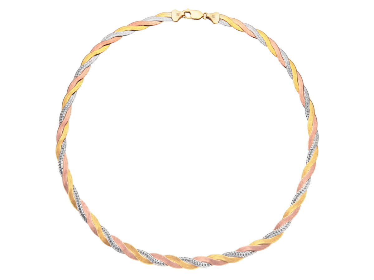 Krásný stříbrný náhrdelník s nádherně propletenými a diamanty broušenými řetízky. Nádherná varianta TRICOLOR - rhodiovaný, zlacený růžovým a žlutým zlatem....