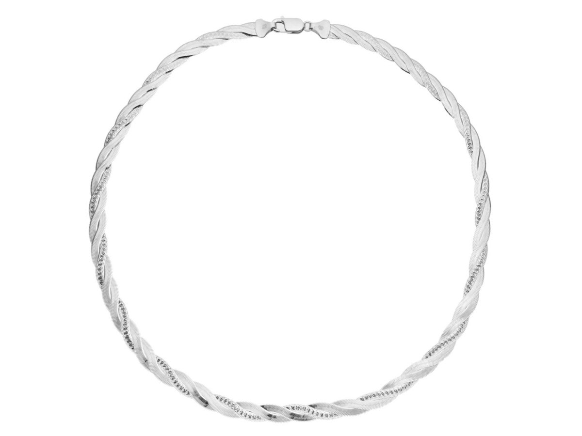 Krásný stříbrný náhrdelník s nádherně propletenými a diamanty broušenými řetízky. Nádherná varianta TRICOLOR - rhodiovaný, zlacený růžovým a žlutým zlatem....
