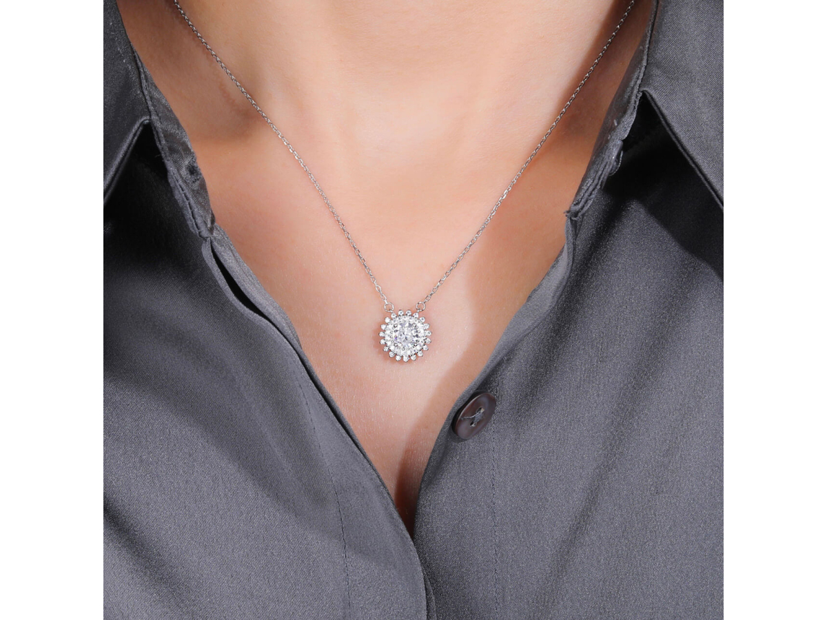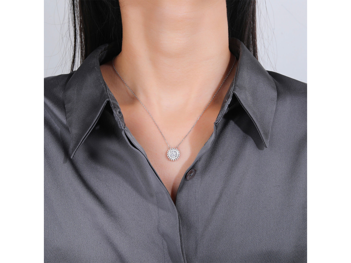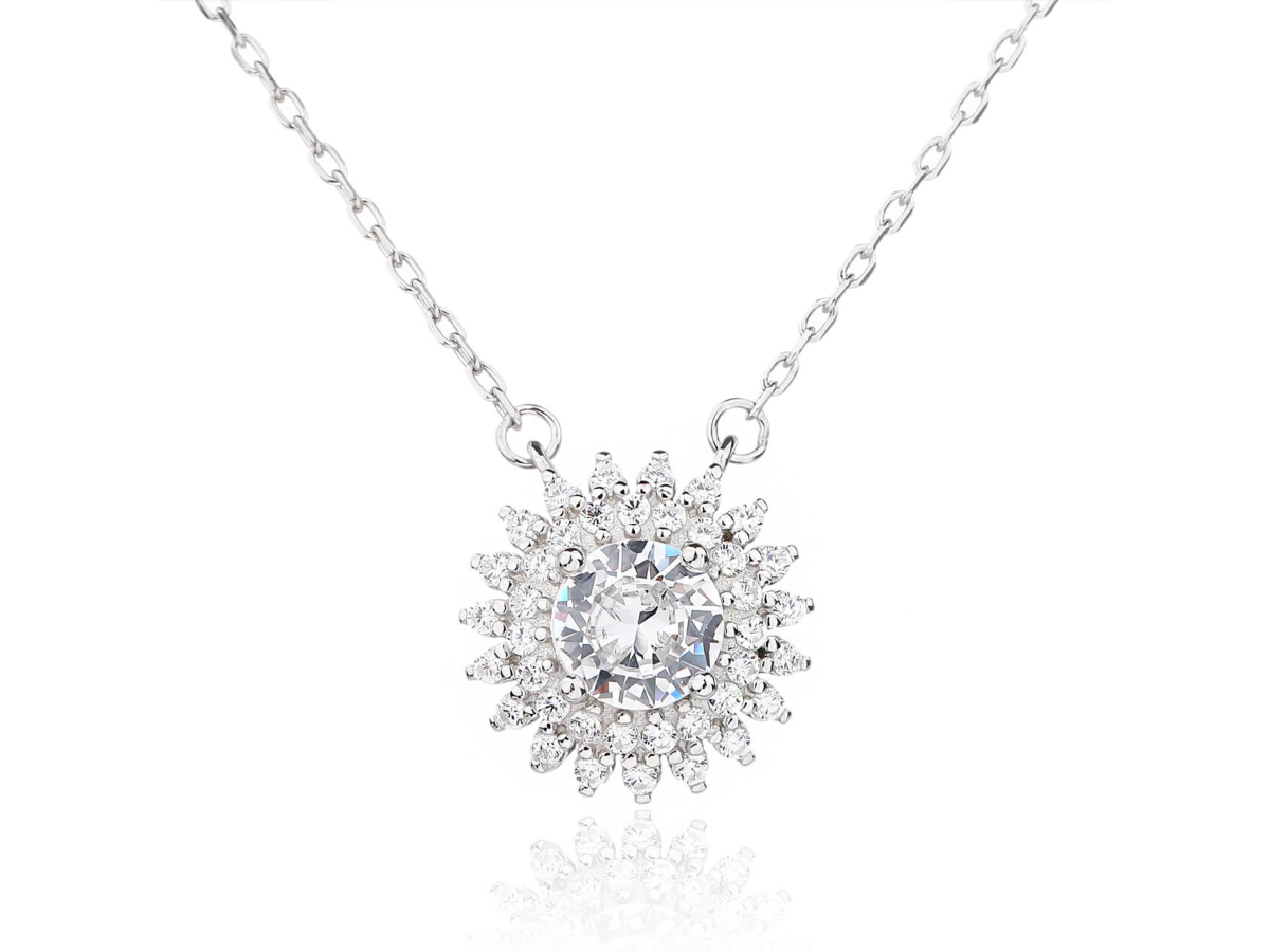- Stříbrný náhrdelník vás okouzlí svým třpytem i výrazným bílým kamenem, který je obklopen čirými zirkony připomínajícími paprsky.
