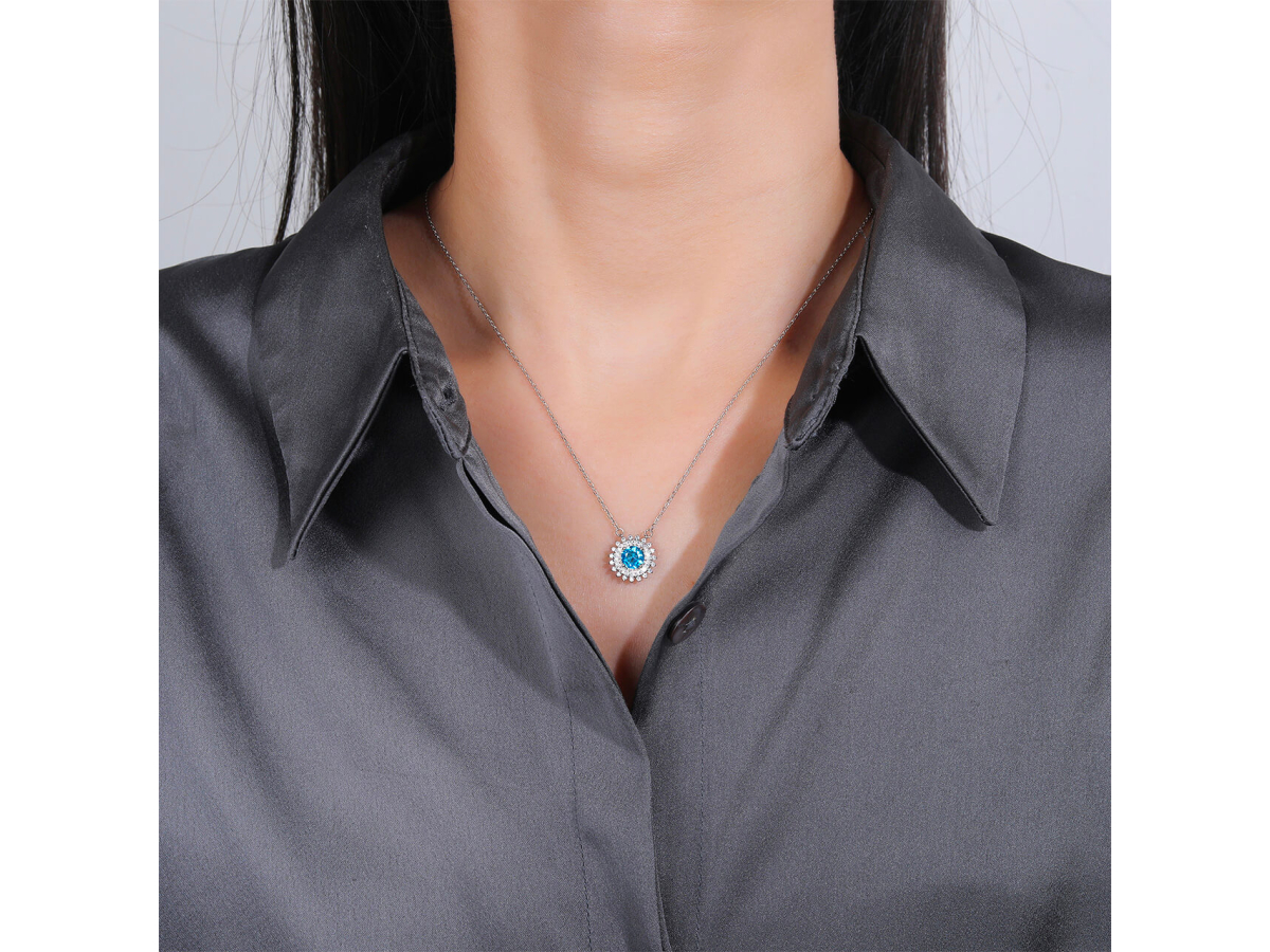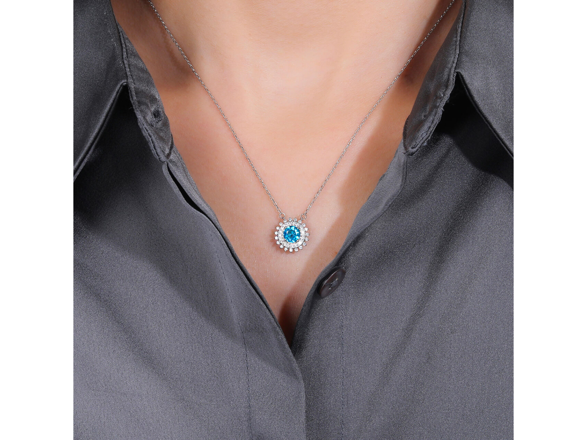 - Stříbrný náhrdelník vás okouzlí svým třpytem i výrazným modrým kamenem, který je obklopen čirými zirkony připomínajícími paprsky.