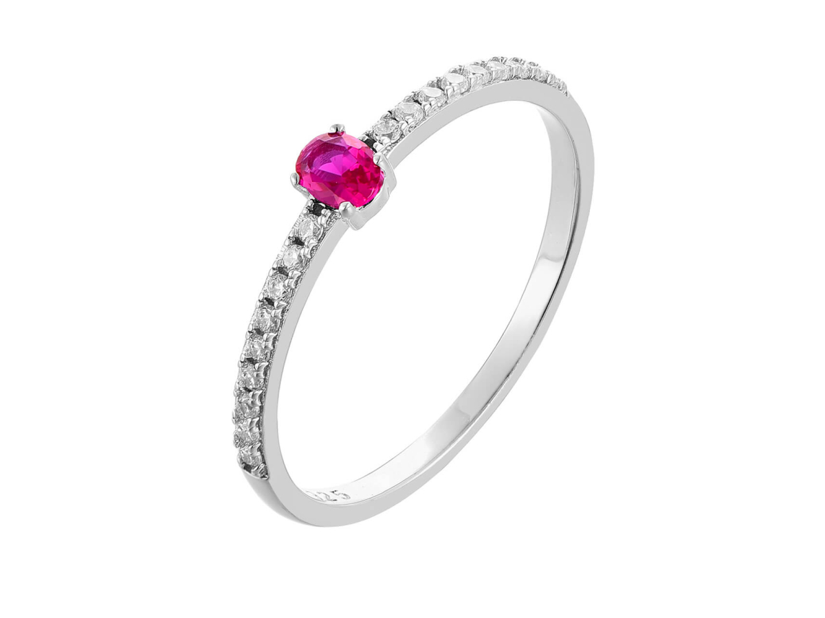 - Tento jemný prsten vás okouzlí svým centrálním červeným zirkonem v rubínovém odstínu, který je symbolem vášně a lásky.