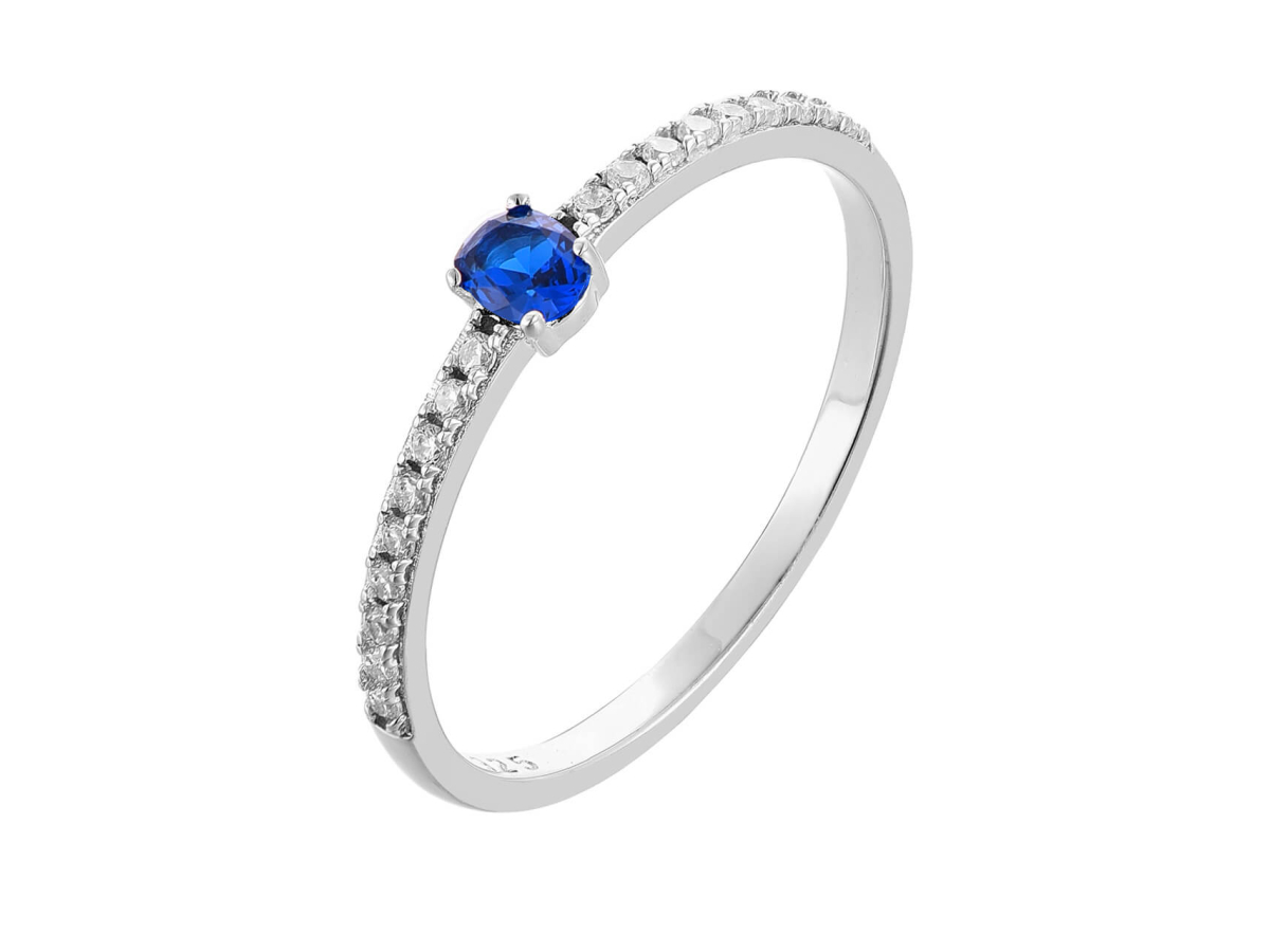 - Tento jemný prsten zdobí modrý zirkon v odstínu safíru, který působí elegantně a ušlechtile.
