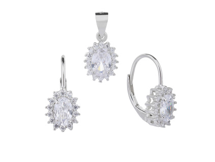 Stříbrná souprava s krásnými čirými zirkony. Ideálně slazené šperky náušnice s přívěskem. Zajistí vám neustálou ladnost a eleganci v každé situaci.